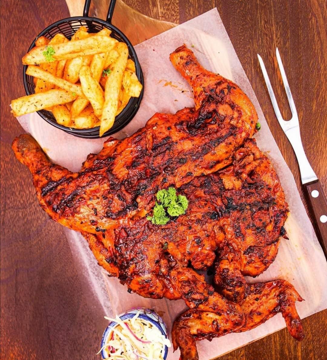 Frangos Bar & Churrasqueira is conveniently situated in the Yaya area. It is a dynamic part of Nairobi, home to the famous Yaya Centre Mall and numerous businesses, making it a hub for shopping, dining, and entertainment. Its central location ensures easy access for locals and visitors, whether for a quick lunch, a leisurely dinner, or a night out with friends. The atmosphere at Frangos is energetic and inviting, with a modern yet rustic charm. The restaurant’s interior is designed to reflect the warmth and simplicity of Portuguese culture, with wooden furnishings, earthy tones, and lively decorative elements that create a welcoming environment.