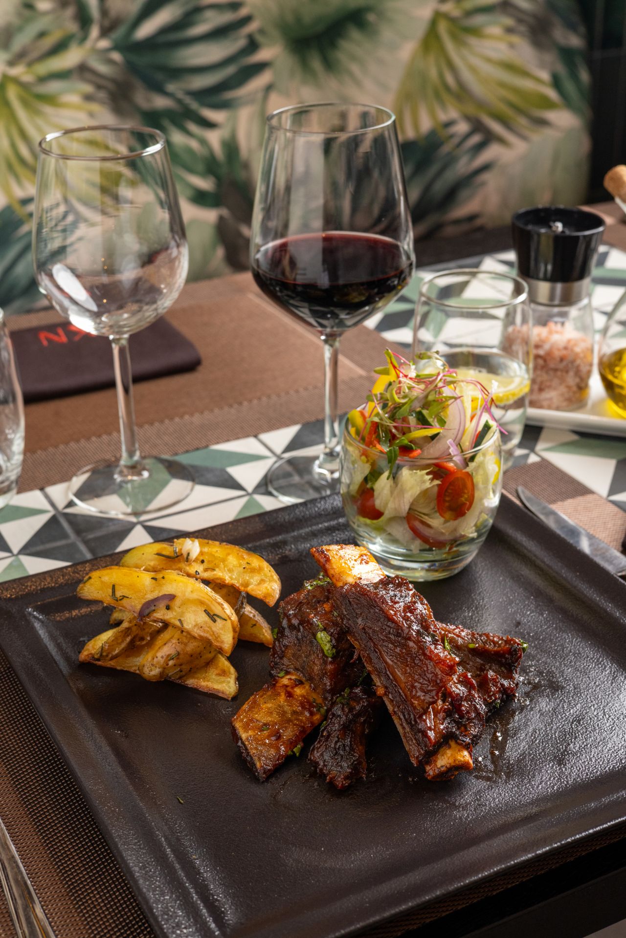 oOven roasted half chicken, bbq wings, beef short ribs, two sides of your choice