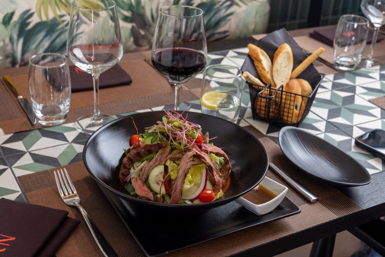 Grilled beef fillet, cucumber, tomato, onions, fresh chili fragrant herbs and, sesame lime juice dressing